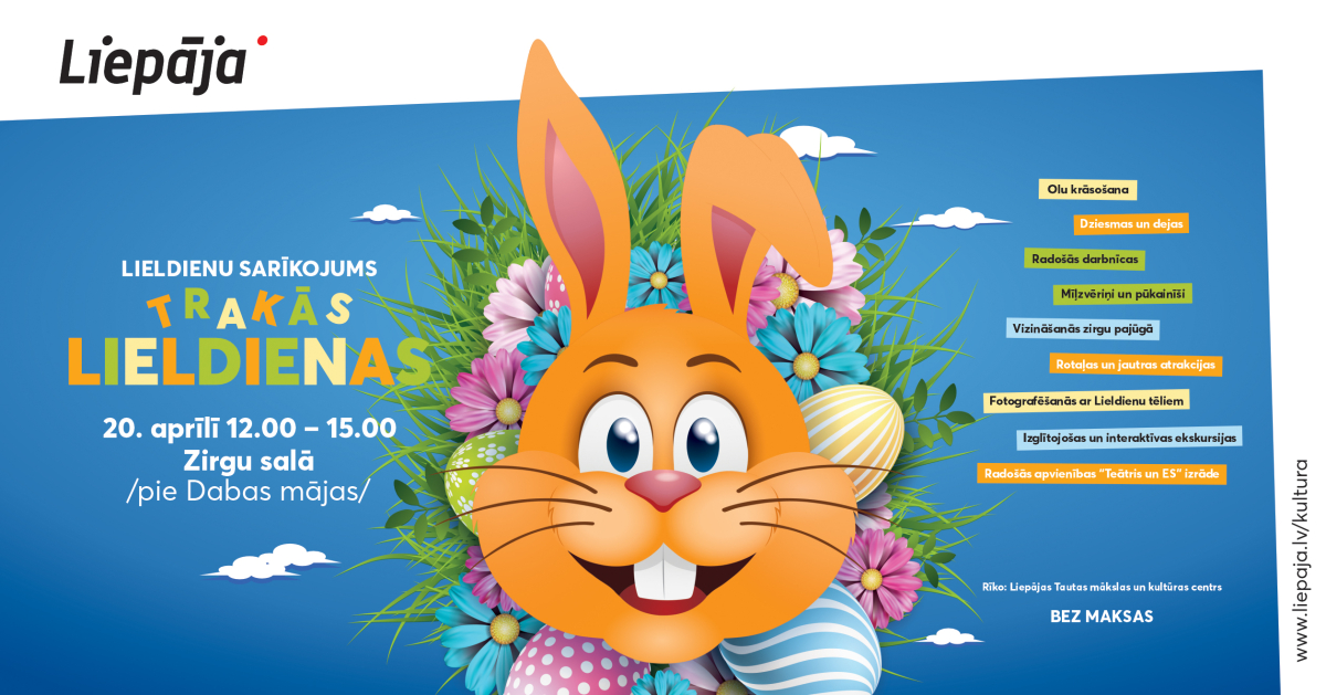 Liepājas valstspilsētas pašvaldība aicina liepājniekus un pilsētas viesus otro gadu pēc kārtas svinēt Lieldienas dabā – Zirgu salā.  Līdztekus ierastajām Lieldienu aktivitātēm apmeklētāji varēs baudīt pavasara atmodu – doties 4 km garā pastaigā, vērot putnus no skatu torņa un iepazīt dabas noslēpumus izglītojošās ekskursijās “Dabas mājā”.