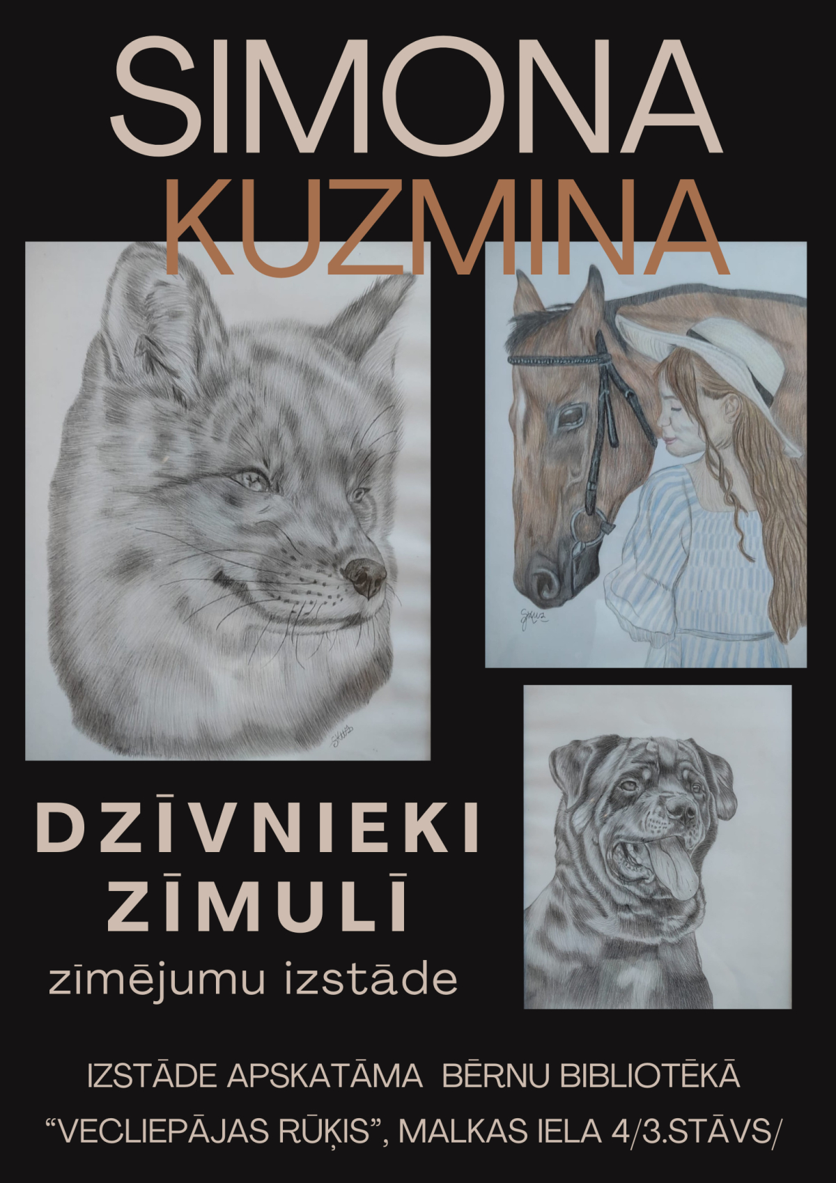 2025.gada 6.novembrī bērnu bibliotēkā “Vecliepājas rūķis” plkst. 15.00 tiks atklāta jaunās, talantīgās mākslinieces Simonas Kuzminas zīmējumu izstāde, kurā galvenie varoņi ir dzīvnieki. Viņai ir 16 gadi, un viņa zīmēt iemācījusies pašmācības ceļā. Simona mācās Kuldīgas tehnoloģiju un tūrisma tehnikumā.