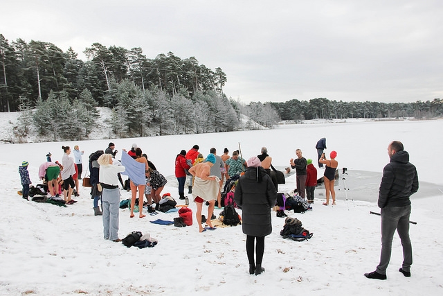 Ziemas peldēšanas vietā pieejama pārģērbšanās kabīne un soliņi mantu novietošanai.