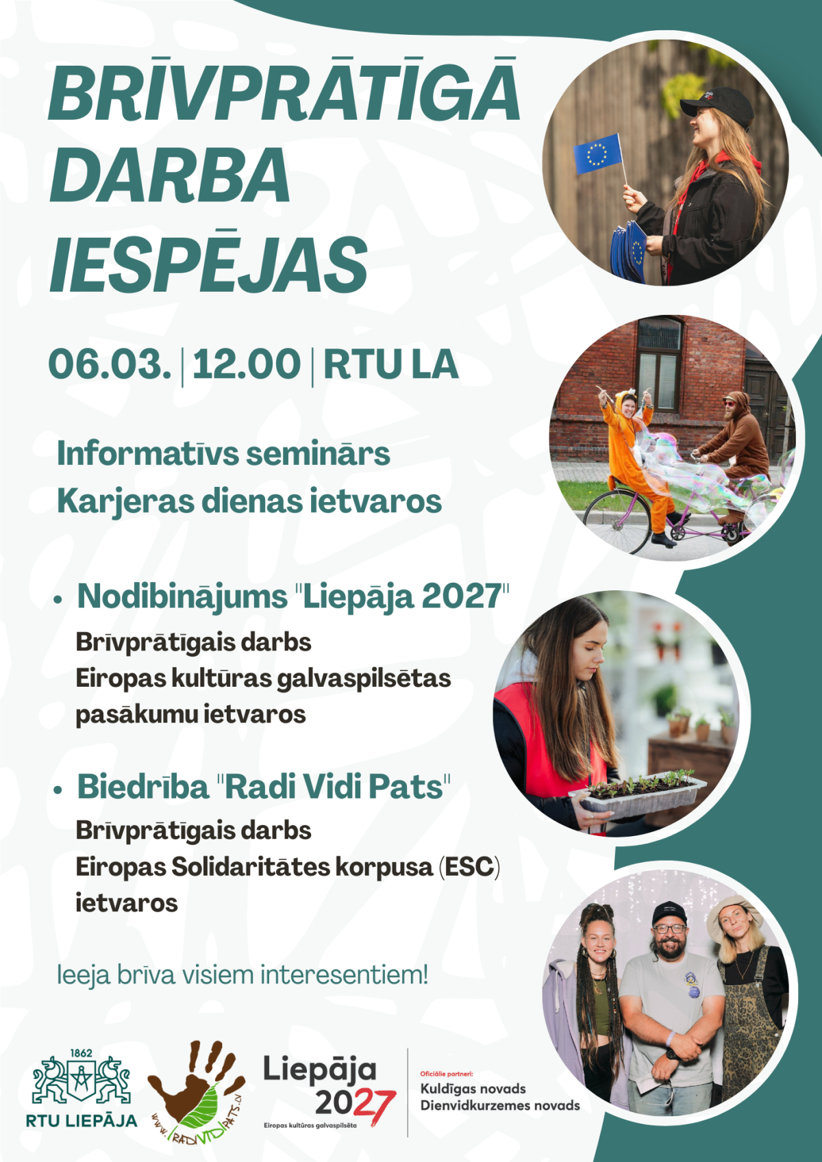 2026. gada 6. martā plkst. 12.00 RTU Liepājas akadēmijas Aktu zālē notiks iedvesmojošs pasākums Karjeras dienas ietvaros, sniedzot iespēju gan esošajiem, gan topošajiem studentiem uzzināt par brīvprātīgā darba iespējām.