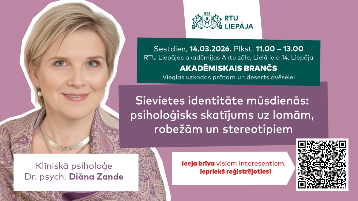 Lai sniegtu iespēju plašākam interesentu lokam apmeklēt izzinošas un iedvesmojošas lekcijas, RTU Liepājas akadēmijā turpinās pasākumu cikls «Akadēmiskais brančs». Nākamais pasākums norisināsies 14. martā plkst. 11.00 RTU Liepājas akadēmijas Aktu zālē un būs veltīts sievietes identitātes dažādajām šķautnēm mūsdienās.