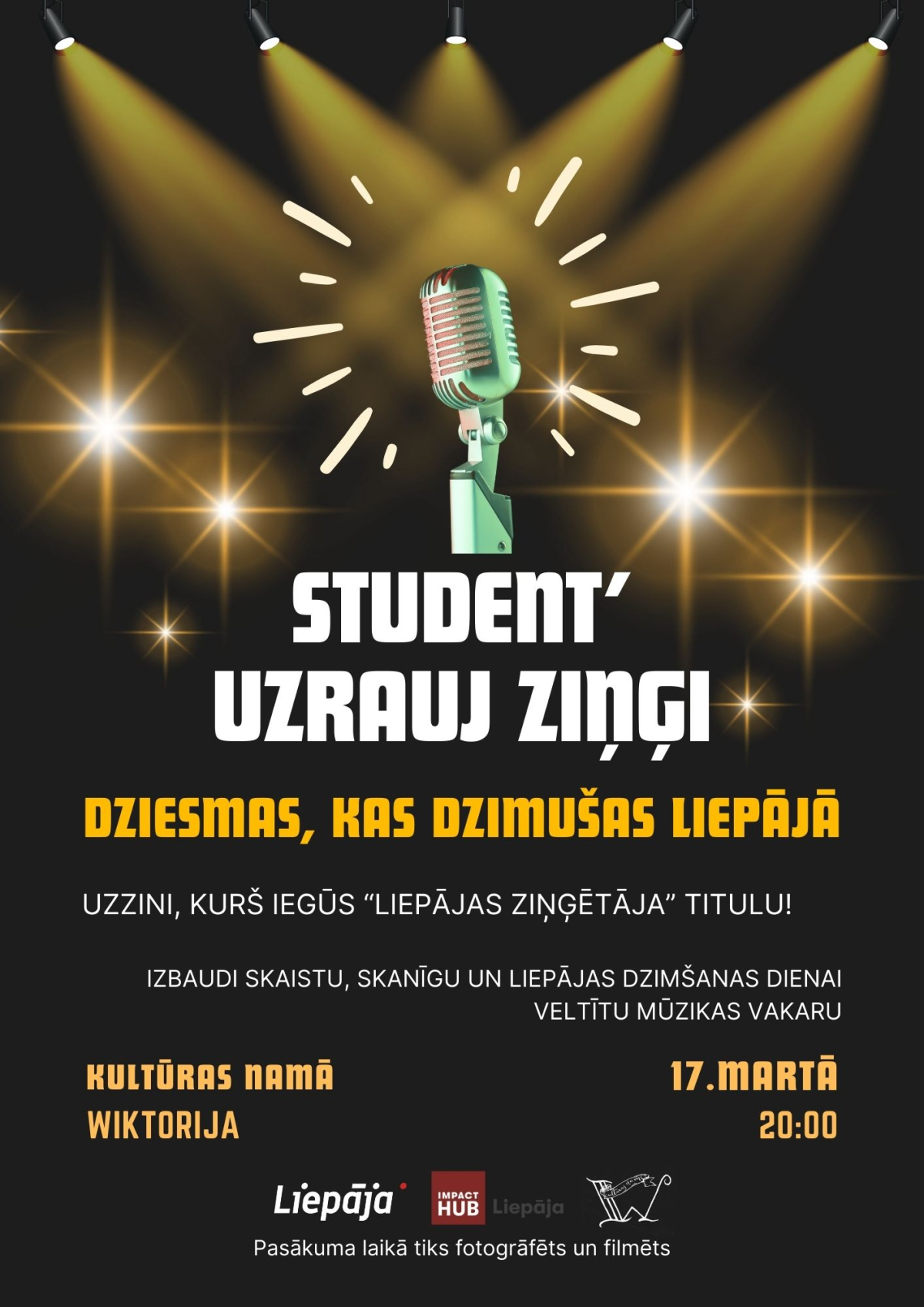 Par godu Liepājas dzimšanas dienai aicinām uz muzikāli krāšņu vakaru – "Student' uzrauj ziņģi!" finālu, kas norisināsies 17. martā plkst. 20.00 Kultūras namā "Wiktorija".