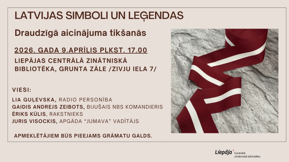 2026. gada 9. aprīlī plkst. 17.00 Liepājas Centrālā zinātniskā bibliotēka aicina uz tikšanās cikla “Draudzīgais aicinājums” pasākumu, kura devīze ir “Latvijas simboli un leģendas”. Liepājā viesosies sabiedrībā zināmi cilvēki – radio personība Lia Guļevska, apgāda “Jumava” vadītājs Juris Visockis, rakstnieks Ēriks Kūlis un bijušais NBS komandieris Gaidis Andrejs Zeibots. Pasākumā tiks runāts par Latvijas simboliem un mūsu kultūras leģendām, īpaši izceļot tādas personības kā Zenta Mauriņa, Raimonds Pauls un Jānis Peters.