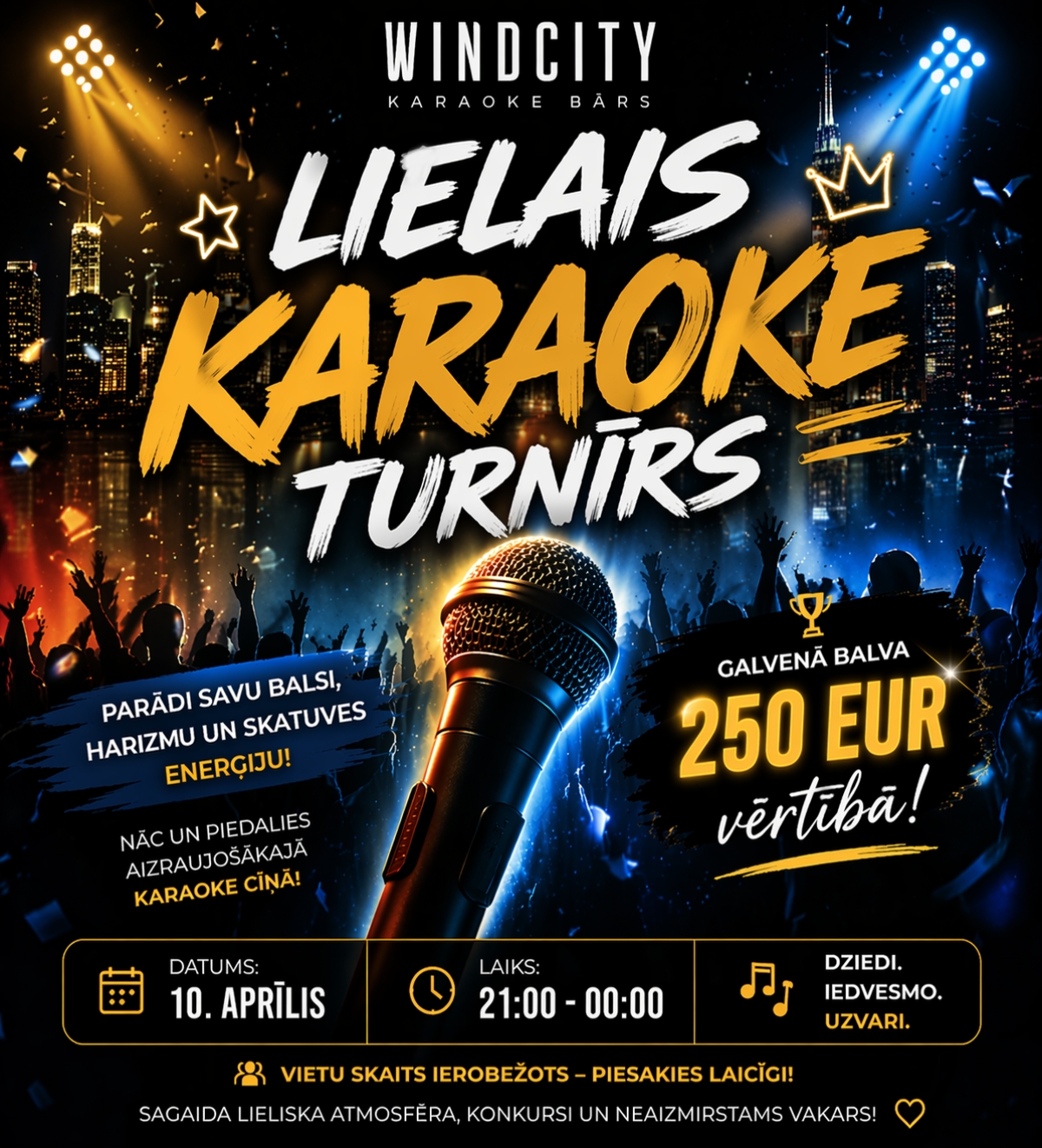 Parādi savu balsi, harizmu un skatuves enerģiju Lielajā Windcity karaoke turnīrā! Galvenā balva €250 vērtībā! Tevi vērtēs 3 žūrijas locekļi, kā arī skatītāji klātienē un sociālos tīklos.