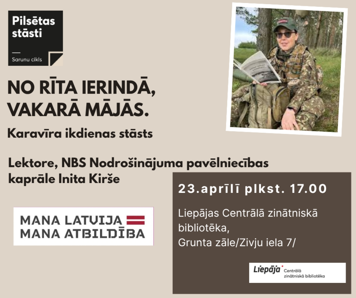 2026. gada 23. aprīlī plkst. 17.00 Liepājas Centrālajā zinātniskajā bibliotēkā viesosies NBS Nodrošinājuma pavēlniecības kaprāle Inita Kirše.