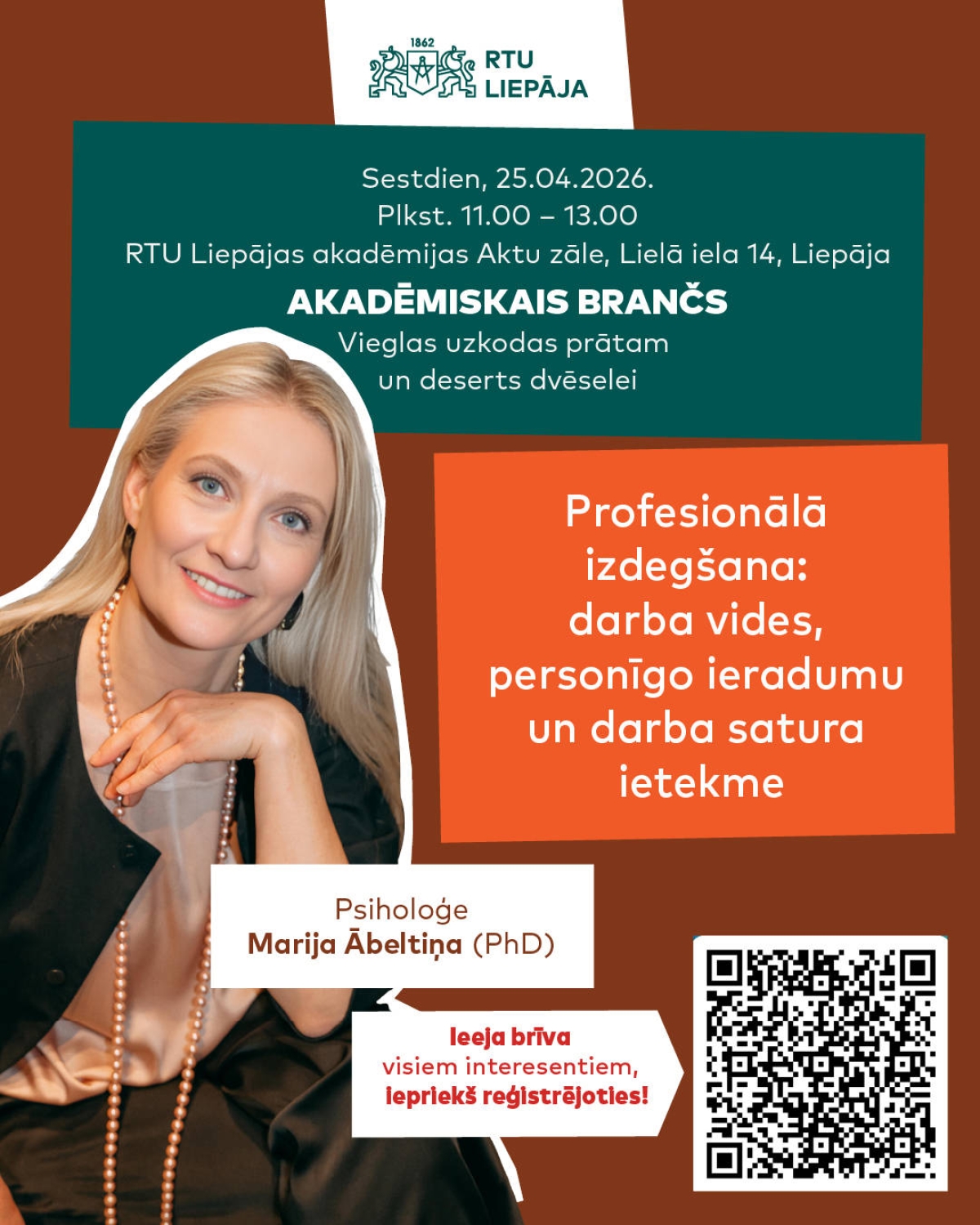 RTU Liepājas akadēmijā turpinās bezmaksas pasākumu cikls “Akadēmiskais brančs”, sniedzot iespēju jebkuram interesentam izzināt sabiedrībā aktuālus tematus.  Šī studiju gada noslēdzošais pasākums būs veltīts profesionālajai izdegšanai un ar to saistītiem jautājumiem.